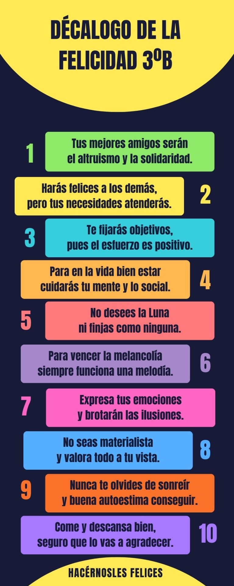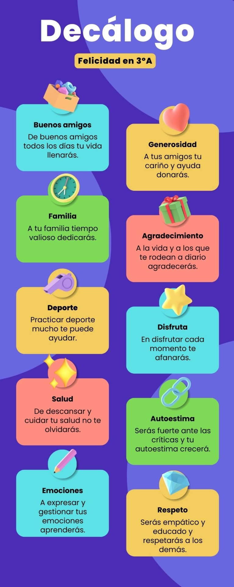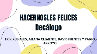 Los alumnos de 3º han elaborado en clase unos decálogos de la felicidad en distintos formatos, con sus normas o consejos para iniciarse en el camino de la felicidad. Compartimos con vosotros algunos de ellos: